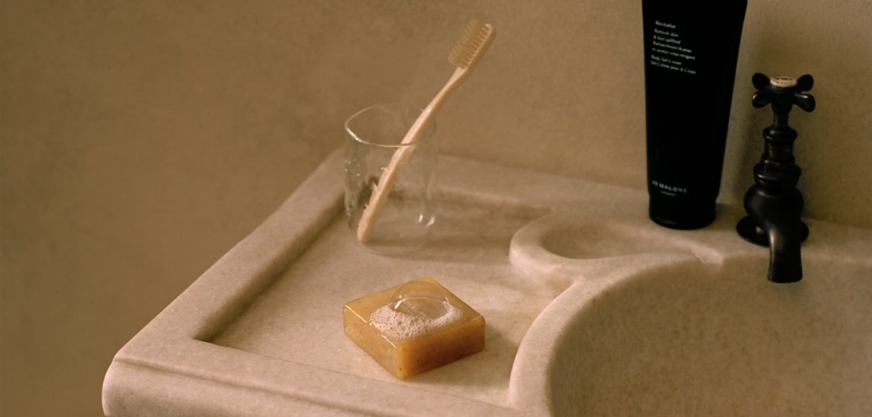 We are used to the stories around the development of Jo Malone London’s fragrances opening with the ingredients. This time however, with the development of the Care Collection, the story begins elsewhere. ‘We started thinking about this around 2018,’ reveals Céline. ‘I worked with a friend and archaeologist and we began the deep dive.’ This ‘deep dive’ involved intently studying the Roman bath house rituals that consisted of resting, steaming the skin to open the pores, massaging and bathing in separate rooms and waters of different temperatures, which all served different purposes, delivering numerous benefits to one’s skin and well-being.